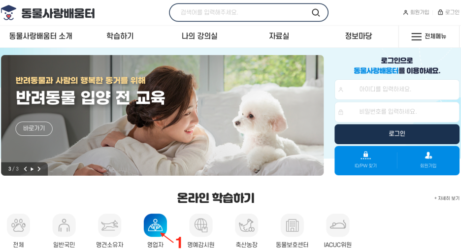 교육 수료증은 동물사랑배움터 홈페이지에서 3시간짜리 교육을 이수하면 받을 수 있어요.