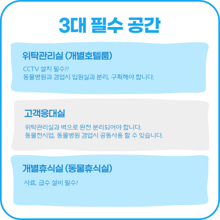 기본적으로 애견호텔, 애견유치원은 ①위탁 관리실 ②고객 응대실 ③개별 휴게실을 갖춰야 합니다.