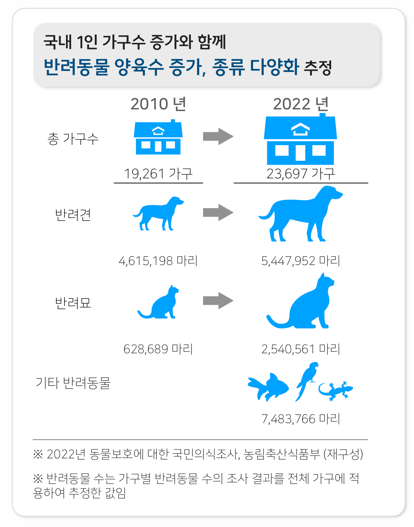 조사에 따르면, 1인 가구가 급증하면서 반려동물의 수도 늘어났다고 하네요.