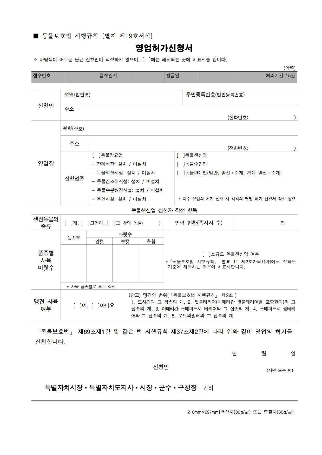 동물판매업 허가를 신청할 때는 아래의 서류를 갖춰야 합니다.