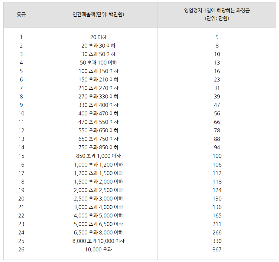아래 표를 참고해서 과징금 납부가 나을지, 영업정지가 나을지 판단하시면 되겠습니다.