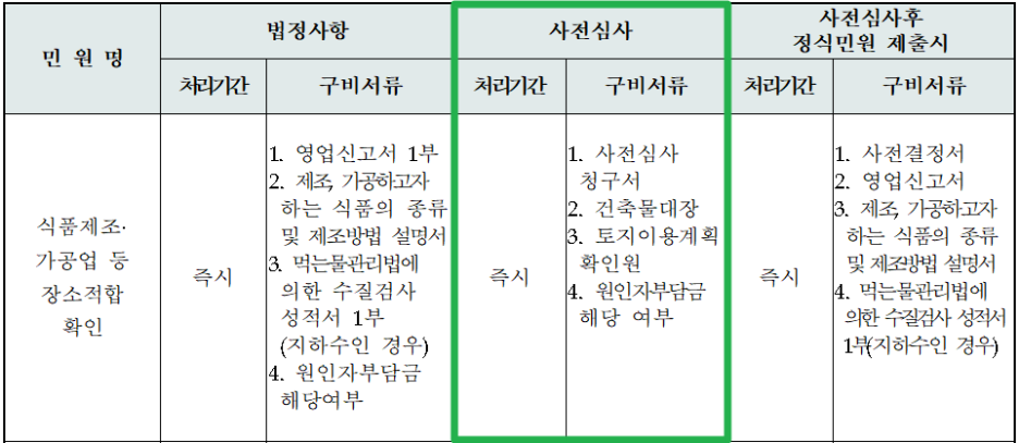 예를 들어 성남시의 식품제조업 사전심사에 필요한 서류를 보면, 입지에 대한 사항을 확인함을 알 수 있습니다.