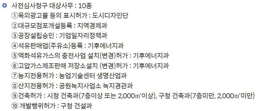 수원시의 경우, 아래 민원에 대해 사전심사 제도를 운영하고 있습니다.