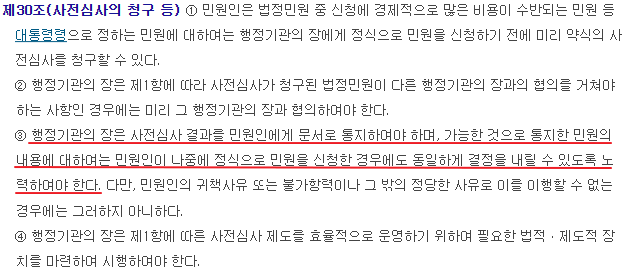 사전심사를 통해 '가능'하다고 통지한 민원은, 정식 신청한 경우에도 동일하게 결정하도록 노력해야 한다고 규정되어 있습니다.