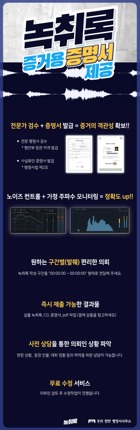 저희 사무소는 음향 분석 프로그램을 사용 등 질높은 녹취록 작성을 위해 최선을 다하고 있습니다.